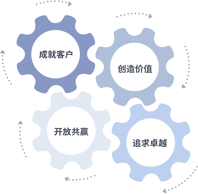 成就客户是一切决策的出发点,,,,创造价值是衡量所有工作的标准,,,追求卓越是我们做事做人的态度,,开放共赢是我们的格局也是最终的结果。。价值观的齿轮环环相扣,,推动着组织里的每个人不断向前。。。。
